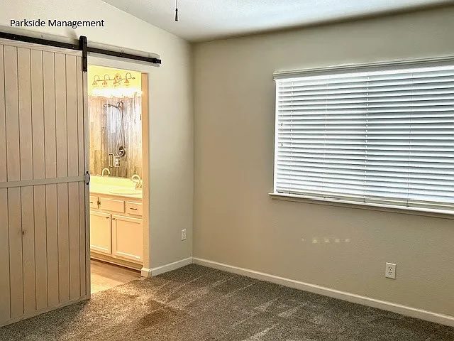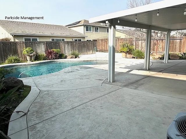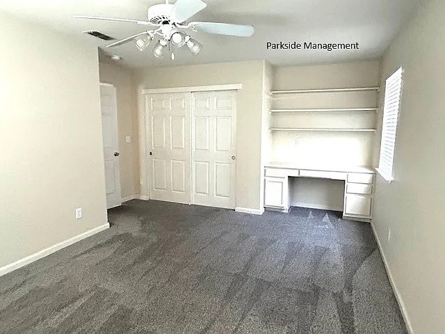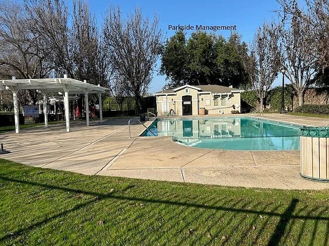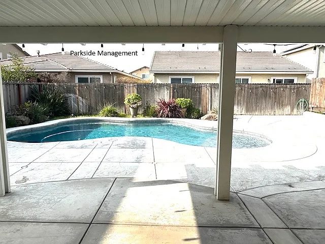 Family room complete with lovely built-ins. Sliding glass door opens up to large covered patio and a sparkling pool designed with a ledge lounge area. Custom concrete in most of backyard with low maintenance landscaping. Gardening and pool service provided by Owner. Bedrooms are located upstairs all with new carpeting. Master bathroom has lovely barn door slider along with custom shower stall. Community pool & park available for all residents of our home.